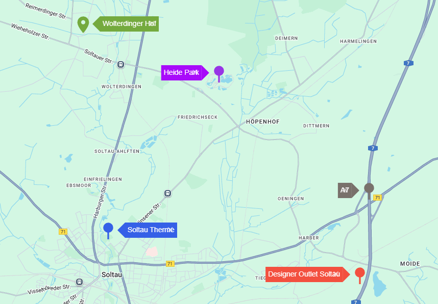 Ihr findet uns im ländlichen Teil von Soltau im Ortsteil Wolterdingen. Nur 10km von der Autobahn A7 entfernt. Hier im nördlichen Teil befindet sich in etwa 3km Entfernung auch der Freizeitpark Heide Park Resort.